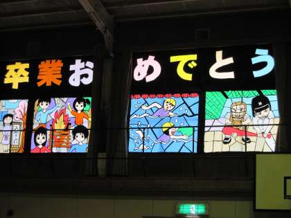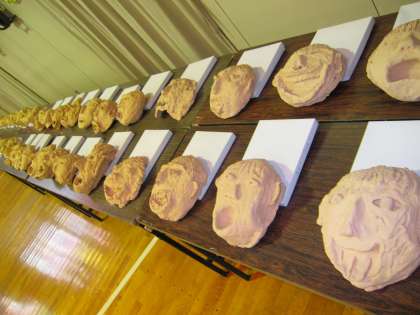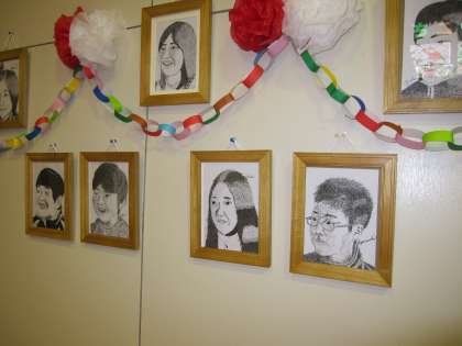 明後日の卒業式の式場が、6年生の「自画像」や粘土の焼成作品、ステンドグラスできれいに飾られています。特に、図工の時間に作った「自画像」は力作です!