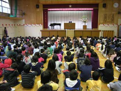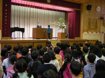 年度のしめくくりの日があいにくの雨となってしまいましたが、落ち着いた雰囲気の中で『平成21年度修了式』を行い、各学年に修了証書を授与しました。