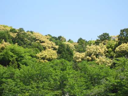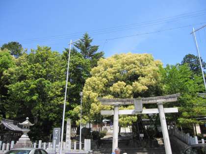 八幡社で地域の会合があり、神社の森を眺めると緑がもこもこと盛り上がるような感じでした。黄色く見えるのは、シイの木です。