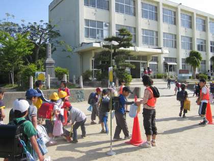 と元気よく呼びかけ、登校する子たちも元気よくこたえています。