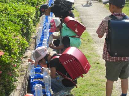 学校へ着くなり、育てているアサガオやミニトマトに水やりをしている子の姿がありました。心の優しい子たちです。