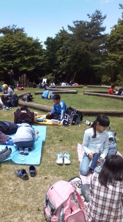 爽やかな風が吹く中、子供達は笑顔でおにぎりやサンドイッチを頬張っていました。