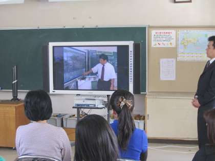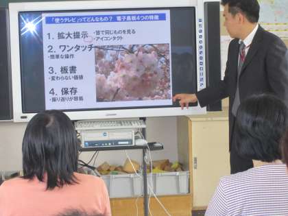 写真は、幡山東小学校に講師を招いて、テレビの機能とその操作方法を教えてもらっているところです。テレビを用いた授業のVTRを視聴し、活用の仕方についても学ぶことができました。