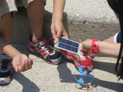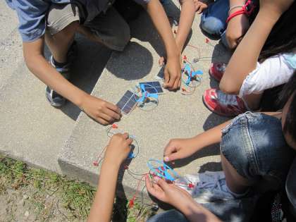光電池とモーターや豆電球を手にした子どもたちは、より明るくしたい、速くしたい、強くしたいという思いから、いろいろな工夫を始めていきました。