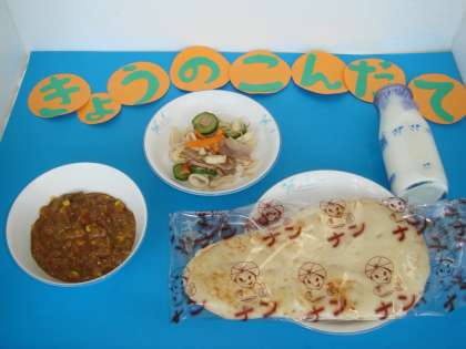 ♪6月4日♪ 公開日 2010/06/04 更新日 2010/06/04 給食室より 今日の給食は、 ・ ナン ・ ドライカレー ・ イカリングサラダ ・ 牛乳 でした。 今日は、ナン! 私は2−3の教室で一緒に給食を食べたのですが、見事完食!! おかわりを呼びかけると、おかわりの行列がずらっとできました。 サラダも、ナンも、牛乳までも見事に売れていきました。 ※よく冷えた牛乳がとても美味しい!(U) いいね(0)