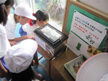 生物多様性に関する『学習マンガ』(貸し出しOK)と、子どもたちの大好きな『カブトムシの幼虫』です。