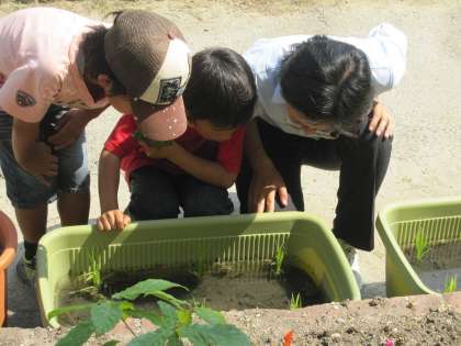 低学年の子どもと担任の先生が、学校にある『田んぼ』をのぞき込んでいました。