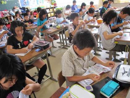 5年生の教室では、玉結びや玉どめをマスターした子どもたちが『なみ縫い』に挑戦していました。はじめての針仕事にもみな熱心で、うまくできていたので感心しました。