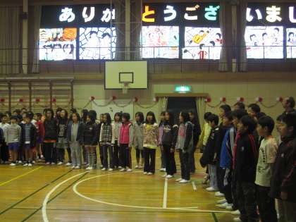 11日(金)、1年生から5年生が体育館に集まり、「おめでとう」「ありがとう・さようなら」の気持ちがよく伝えられるように合同練習をしました。