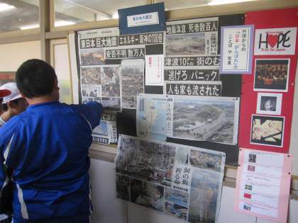 廊下掲示板に張り出された「東日本大震災」の新聞記事に見入る子どもたちです。