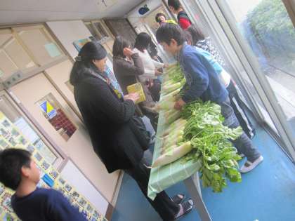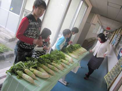 大きさはやや小ぶりですが、色と形のよい無農薬有機栽培のダイコンは、先生たちに大好評。子どもたちは、自分たちで収穫したものを人に喜んでもらえて、とても嬉しそうでした。
