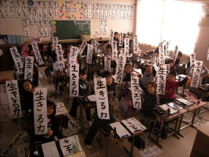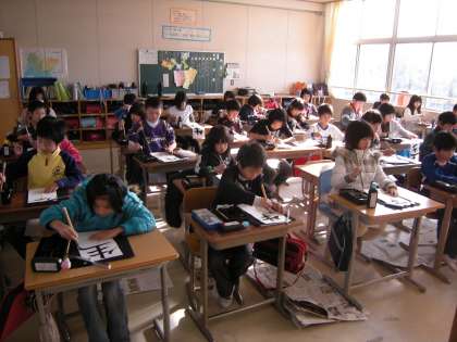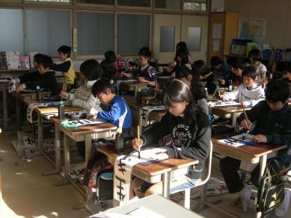 書き初め 公開日 2012/01/13 更新日 2012/01/13 日々のページ 3学期の書写のスタートは書き初めです。書き初めはふつうの半紙と異なり、なぜか長い紙に書きます。一字書くごとに紙を動かさなくてはならず、作品を仕上げるのに苦労をします。そんななか、新年の改まった気持ちで書き初めをしていました。(写真は4年生の様子です) いいね(0)