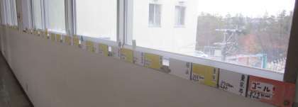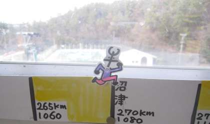 現在の東京マラソンの走行距離が一目でわかるように、写真の『東京マラソン街道(コース)』を掲示しました。そこに、今の自分の位置をマークします。※ただし、マーク付けは自由です。