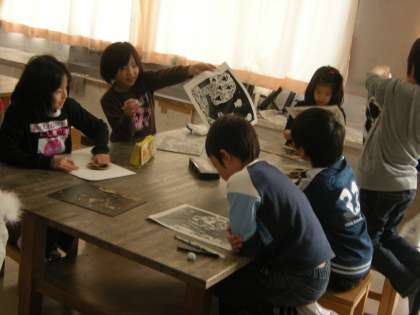版画作品づくりの最終段階に入りました。どの学年も、印刷に入っています。