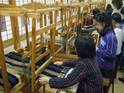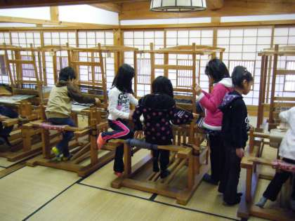 はた織り体験の様子です。始めは「難しい〜」「よく分からない・・・」といっていた子ども達ですが、慣れてくると「かんたん!」「楽しい!」という声もあがり、みんなで楽しく「竹ひごコースター」を作ることができました。