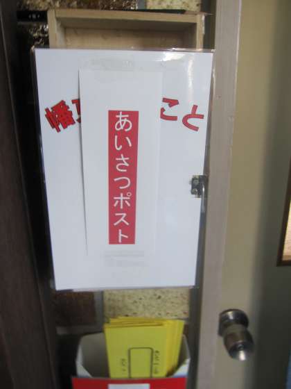 例えば『みんなで 明るい あいさつ いい気持ち!』のような短い文を考えついたら、紙に書いてこのポストに入れてください。