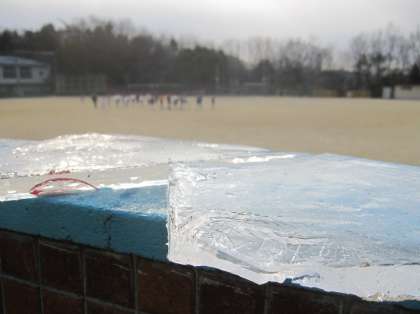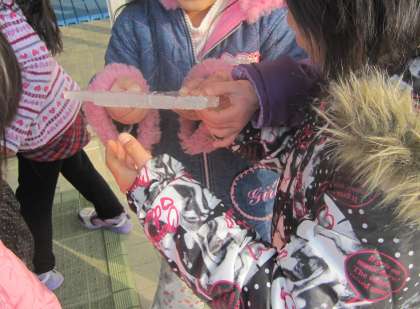 子どもたちが登校してくる頃になると日が照ってきましたが、写真のような厚い氷(1センチ以上あります)を手にしてくる子がいました。