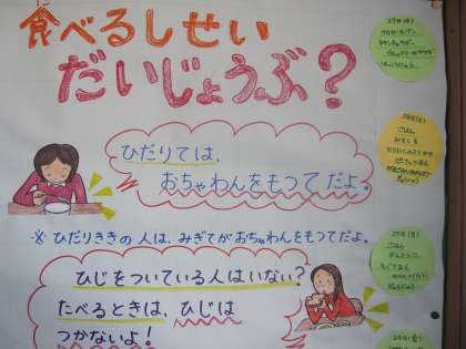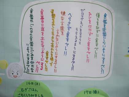 食べっぷりの良さは一級。食べ方は… 公開日 2012/02/03 更新日 2012/02/03 日々のページ 幡東小の子はみんなよく食べる。食べ残しはほとんどない。 これは大変に素晴らしいことで、幡東自慢の一つです。 でも、食べ方はどうかな。 口をもぐもぐしながら歩く子、箸を握るようにして持つ子、ひじを付いて食べる子…いないかな。あまり見好いものではありません。 今月は、みんなで、給食委員会の子たちが作ってくれた『給食マナー9つの掟』に心がけていきましょう。 いいね(0)