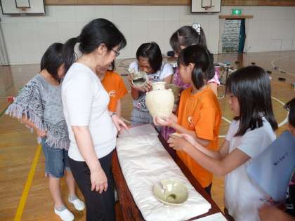 そして今日5月30日(水)は、学校の体育館に瀬戸市で発掘された土器を展示していただき、古墳や出土品についての学習を行いました。