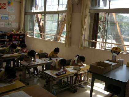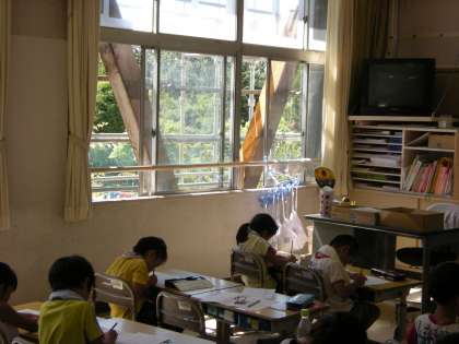 耐震化工事が大詰めを迎えています。教室から窓を眺めてみると写真のようになっています。