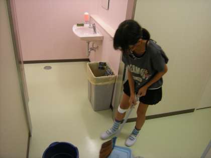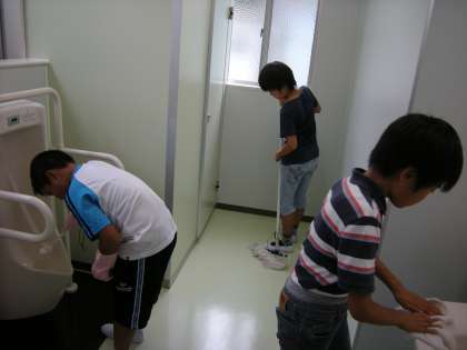 トイレが新しくなり、これまでと清掃の方法が変わりました。水が使えないため、当番の児童は便器を磨いたり、床を掃いたりしてきれいにしています。