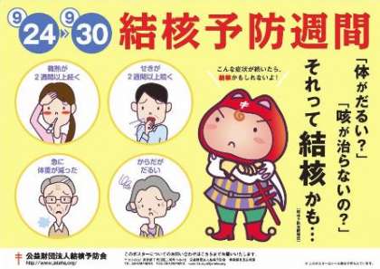 平成24年度結核予防週間 公開日 2012/09/27 更新日 2012/09/27 保健室より 平成24年度結核予防週間 9月24日(月)〜9月30日(日) 日本の結核の現状は、年間約2万3千人の新規患者が発生し、約2千人が亡くなっています。学校では毎年内科検診の際に、「結核問診票」を記入していただき、早期発見に努めています。 咳や微熱が長く続く場合は、早めに受診をしましょう。 〇結核予防週間標語:「胸に空洞!? 失恋ですか? −いいえ、結核です。」 いいね(0)