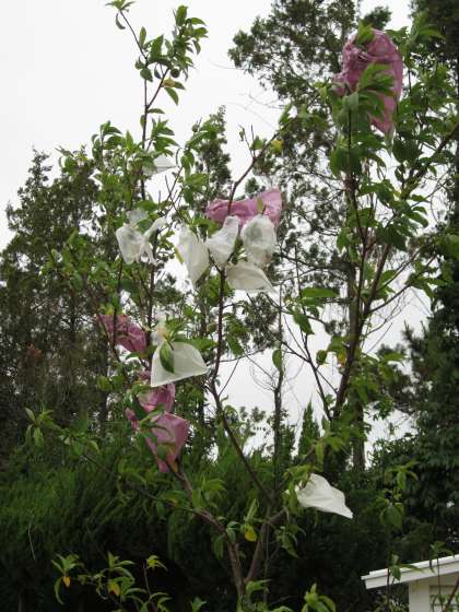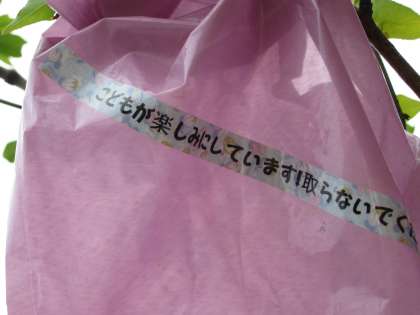 芝生広場に実った桃の実に袋かけを行いました。 収穫が楽しみです。