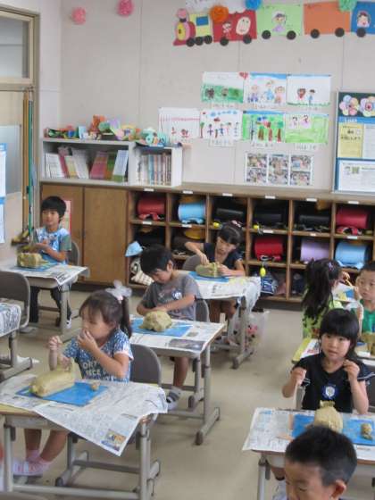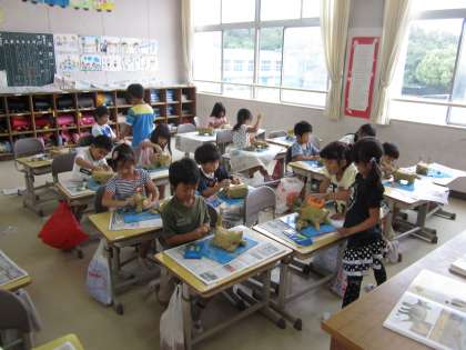 1年生のテーマは「動物」です。大きな粘土を固めたりこねたりするのに苦労しながらも、動物を一生懸命仕上げていきました。