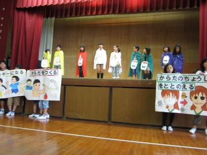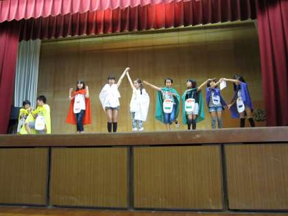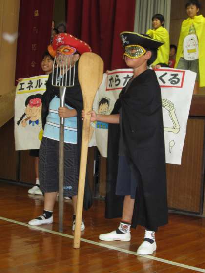 給食委員は、「バランスよく食べることの重要性」について、食まるファイブが訴えました。今年は、メタボ大魔王がパワーアップしているそうです。気をつけてください。