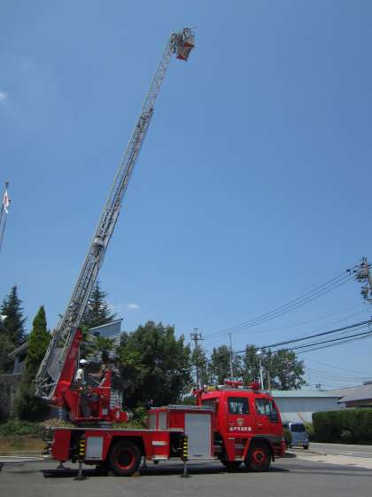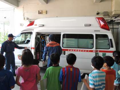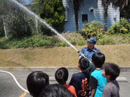 消防署では、消防士の方が休憩を取る場所や、訓練をする場所など普段は入ることができないような場所も見ることができました。また、消防車や救急車、防火服の説明もきくことができました。数名の児童は、放水訓練、はしご車の体験をしました。