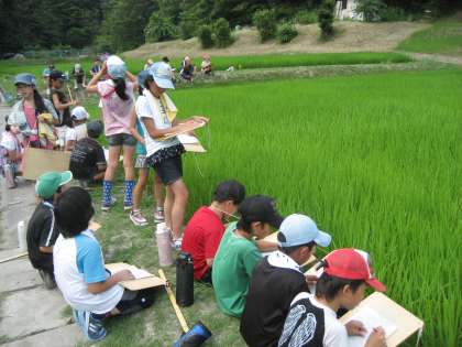 田んぼの生育調査【5年生】 公開日 2013/07/22 更新日 2013/07/22 5年生 5年生が5月に田植えをした田んぼへ学期末に生育調査に行きました。 びっしりと一面に緑色になった田んぼを見て子どもたちは「おー」と歓声をあげました。 社会科の学習でお米作りには水がとても大切だということは学習にしました。 水の管理をして、大切にお米を育ててくださっている地域の人への感謝の気持ちを忘れずに、田んぼや稲の様子を観察してメモをとりました。 いいね(0)