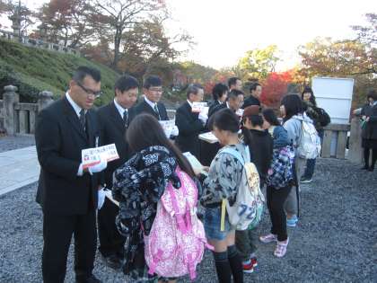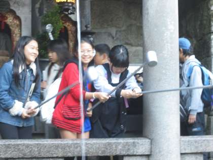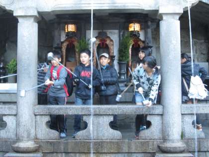 修学旅行ハイライト 2日目 3 公開日 2013/11/24 更新日 2013/11/24 日々のページ 清水寺の「音羽の滝」は人気の的です。願い事をかなえるために、3つの中から1つを選んで、滝から滴る水を口に含みました。 「学業」「恋愛」「健康」の3つの滝の中でも、今年の6年生は「健康」の滝の水を飲む子が多かったように思います。 この後、班別研修で班ごとにタクシーの運転手さんの案内の下で、自分たちの計画を実行しました。 班別研修の様子については、後日、紹介する予定です。 いいね(0)