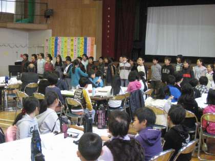 まず、夏の暑い日なども一生懸命に育ててくれた地域の方や、安全に作業できるように手伝ってくれた地域の方たちへ感謝の気持ちをこめて感謝状を渡しました。次に、お米についての発表や合唱・合奏もしました。