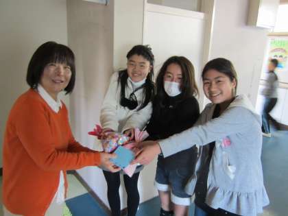 9月より、週に1日子どもたちに支援をしていただいてきたS先生が、本日で本校を去られることになりました。子どもたちへのあいさつで「幡東の子どもたちから元気をたくさんもらえたので、頑張ることができました。みんなの優しさに感謝しています」という言葉ががありました。4年生の時に担任をしてもらった6年生は、感謝の気持ちを込めて贈り物を届けました。