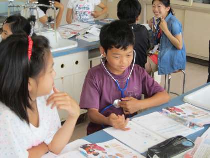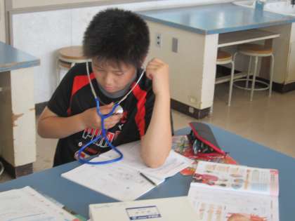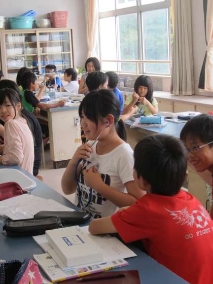 6年生が聴診器を使って、自分自身の心臓の音を聞いていました。何とも言えない不思議な音に、思わずびっくり・・・。 その後、脈拍数と心臓の拍動数が同じであることに気づいていきました。