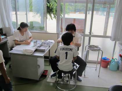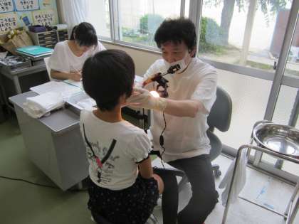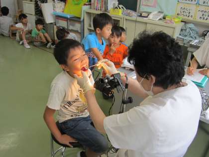 歯科検診が終了しました。子どもたちの歯の様子を見てくださったのは、小島歯科医院の小島一彦先生です。小島先生からは、一人ひとりに虫歯になっている歯や丁寧にみがくとよい歯などを教えていただきました。
