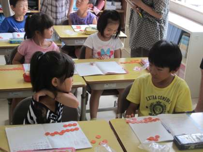 自分の考えを隣の子に説明したり、全体で発表したりしながら、簡単な解き方についてまとめていきました。