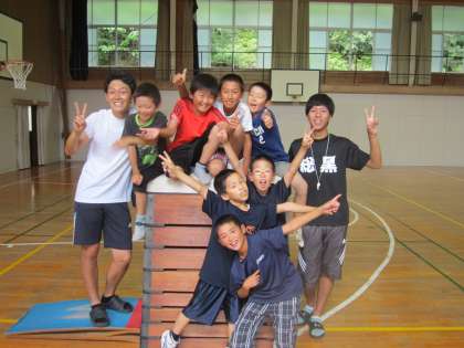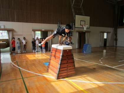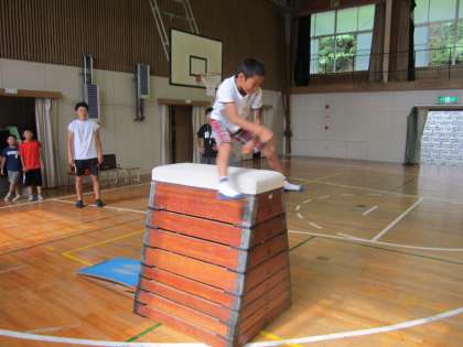7月は、4年生が5時間授業のため部活開始まで時間があります。6時間目は図工室で過ごし、部活が始まるまでの時間に、K先生、N先生の指導の下で体育館で跳び箱の8段跳びに挑んでいました。