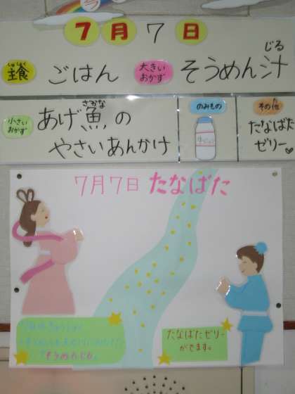 七夕メニュー 公開日 2014/07/07 更新日 2014/07/07 日々のページ 今日の献立は「七夕メニュー」です。そうめんを天の川に見立てた「そうめんじる」や「たなばたゼリー」が出されました。 昼は「七夕メニュー」を楽しみ、夜は「天の川」を眺めてみるのもいいですね。(ちょっと無理かな・・・) いいね(0)
