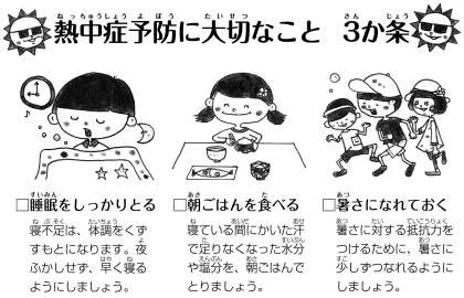 熱中症になる人の中には、夜ねるのがとっても遅い人がいます。すいみん不足になると熱中症になりやすくなるので、夏休みも早寝早起きを心がけましょう!!