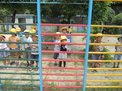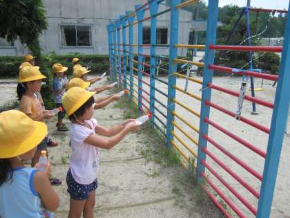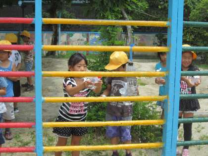 暑い日が続いています。1年生が、涼を求めて(?)水鉄砲を使って、的当てゲームをしていました。とても暑い日だったので、水が服にかかったほうが、かえって気持ちよさそうでした。