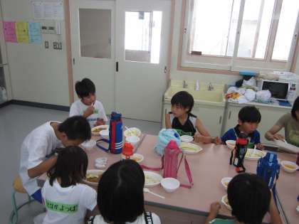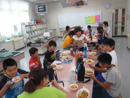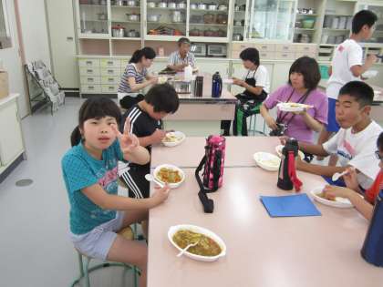 5,6組が幡山3校交流会に出かけた時の昼食風景です。自分たちでカレーライスを作って食べました。