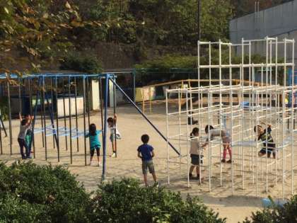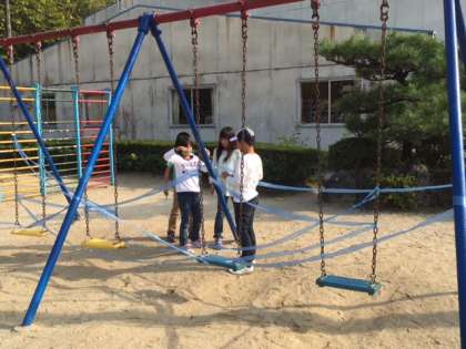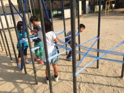 グランドに芸術作品が・・。 公開日 2015/10/20 更新日 2015/10/20 3年生 3年生がビニールテープを遊具などに巻き付けた大きな作品を作っていました。グランドには、子どもたちが作ったユニークで芸術性あふれる作品がたくさん完成しました! いいね(0)