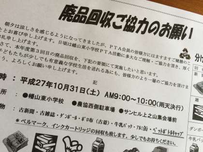 明日の廃品回収、よろしくお願いします。 公開日 2015/10/30 更新日 2015/10/30 PTA広報部 明日は9時から10時まで廃品回収があります。事前回収場所のプールにもたくさんの段ボールや新聞紙が集まっています。よろしくお願いします。 いいね(0)