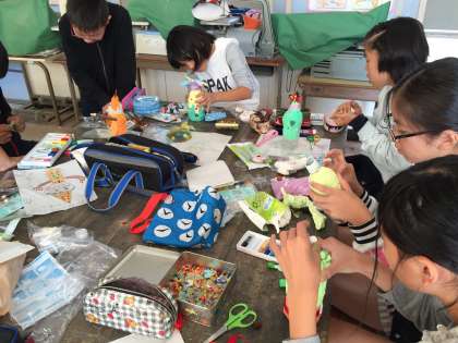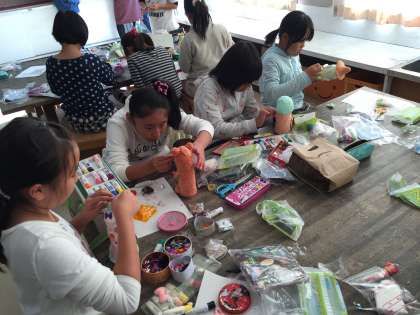 5年生が図工の時間に「ゆめいろらんぷ」という作品を作っていました。紙粘土に色を付けて、ペットボトルに飾り付けしていました。みんな真剣です!!