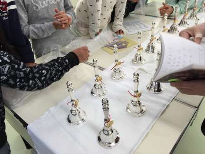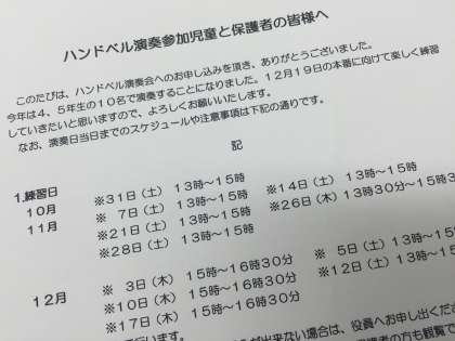 ハンドベルの練習が始まりました。 公開日 2015/11/01 更新日 2015/11/01 PTA広報部 12月19日の演奏に向けて、昨日からハンドベルの練習が始まりました。4年、5年生の10名がどんな演奏をしてくれるのか、今から楽しみです! いいね(0)