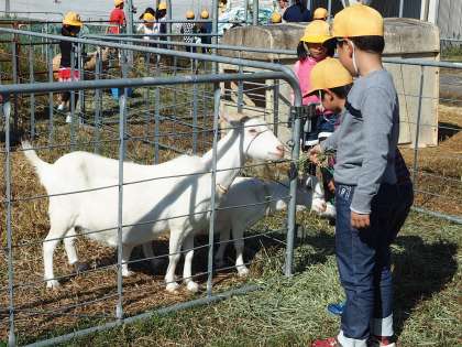 とてもお天気のよい秋の一日、1年生はみずの坂の牧場へ、愛環に乗って出かけました。牛ややぎ・羊にエサをあげたり、聴診器を使ってウサギの心音をきいたりしました。ダチョウやモルモット・アヒルも見ながら動物に親しみを持つことができました。子どもたちは決まりを守って、電車に乗り見学をしました。牧場の方から優しくお話をしていただき、感謝しています。