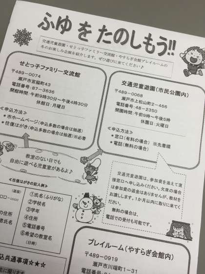 せとっ子ファミリー交流館の方が来校され、冬に行われるさまざまなイベントの案内を持って来てくださいました。子どもたちが楽しめる場を設定していただき、本当にありがとうございます。(掲示板もしっかりと観ていただきました!)