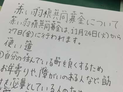 赤い羽根共同募金について 公開日 2015/11/20 更新日 2015/11/20 日々のページ 児童会から写真のようなプリント(赤い羽根共同募金について)が配布されました。来週の火曜日から行われるようです。よろしくお願いします! いいね(0)
