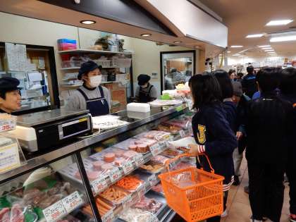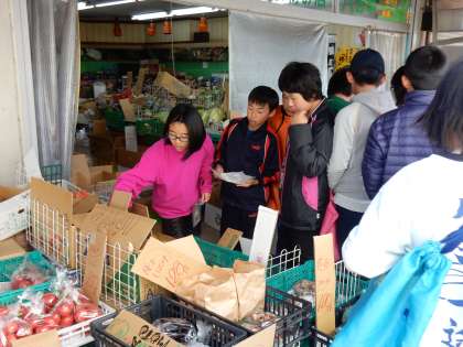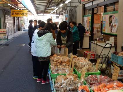 6年生が今週行う家庭科の調理実習での食材を買いに原山商店街へ行きました。